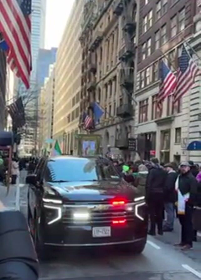 black Chevy Tahoe SUV traveling down a city street lined with American flags. The SUV has red emergency lights flashing. People are standing on the sidewalk watching the vehicle. Buildings line the street, and some are decorated with flags. The license plate on the SUV reads LTB-1522. There are people in the background wearing green. The video seems to be taken during some sort of parade or procession.
