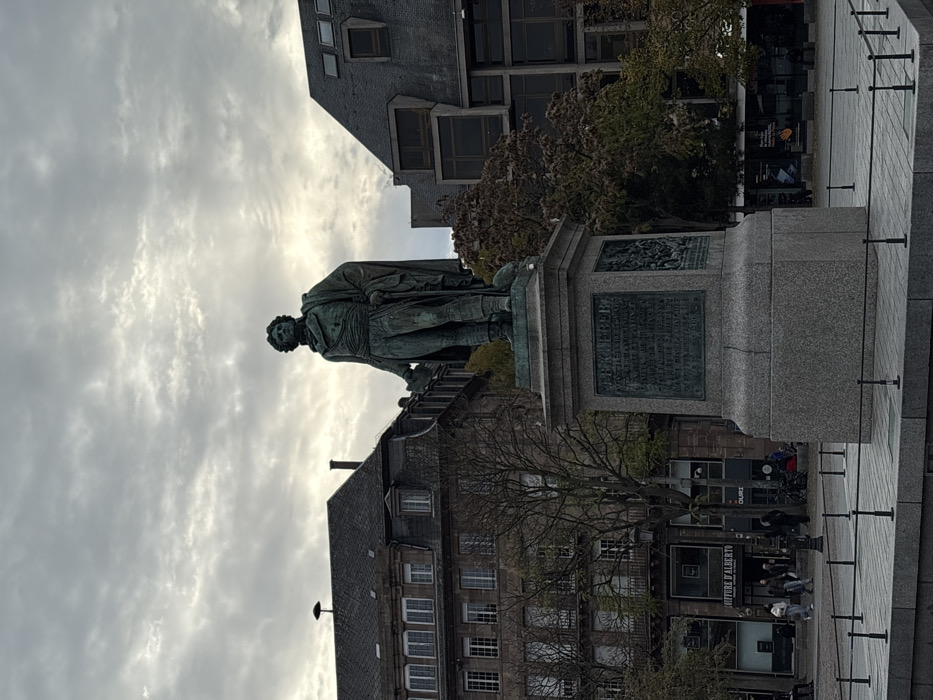 A bronze statue of General Jean-Baptiste Kléber stands prominently on a multi-tiered grey stone pedestal in Place Kléber, Strasbourg, France