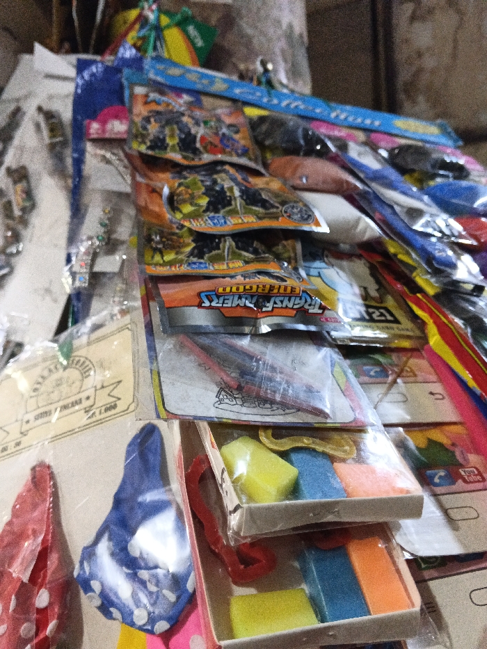 This image captures a close-up, slightly upward-angled view of a densely packed retail display of consumer goods within a market stall or small shop in Pinnwe, Myanmar (Burma). The scene is characterized by numerous small items, primarily toys and novelty products, packaged in clear plastic and arranged against a blurred, light-colored background. In the mid-section, several packages clearly display "TRANSFORMERS ENERGON" branding, featuring illustrations of robot characters. Below these, towards the bottom right of the frame, are two small, open cardboard boxes. The top box contains three distinct rectangular objects colored yellow, blue, and orange, along with a yellow, curved plastic object. The lower box contains similar yellow, blue, and orange rectangular items. These items resemble erasers or small sponges. To the bottom left, a red item with white polka dots and a blue item with white polka dots are visible, consistent with deflated balloons or small fabric bags. Above these, a yellowish label marked "SKATING PARADISE" and "Rp. 1.000" is partially discernible. Various other colorful, individually packaged items are present throughout the display. No individuals, actions, or direct interactions are depicted in the static arrangement of merchandise.