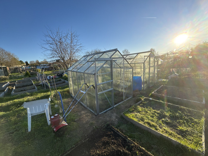 This image depicts an allotment garden under a clear blue sky with direct sunlight and lens flare from the upper right, consistent with conditions in Maidstone, United Kingdom. No individuals are present. In the center-right, two glass and aluminum-framed greenhouses are positioned on a dirt path. The greenhouse on the left is larger, with its access door partially open. A blue plastic water barrel is visible inside the greenhouse on the right. To the left of the greenhouses, a white plastic monobloc chair rests on a grassy patch, adjacent to a red and black motorized rototiller or cultivator. Several long-handled gardening tools, including rakes and hoes, lean against a wooden support structure further to the left. The ground comprises mown grass areas, patches of bare earth, and numerous raised garden beds. In the immediate foreground on the right, a large rectangular raised bed contains cut grass and some green vegetation. Further back and to the left, several other rectangular raised beds are visible, some containing dark, tilled soil, and others appearing to be fallow. A thin, white contrail is visible against the blue sky in the upper center. Deciduous trees, currently bare of leaves, line the distant background, indicating late autumn, winter, or early spring. Various smaller sheds and garden structures are scattered across the background, indicative of a larger allotment site.