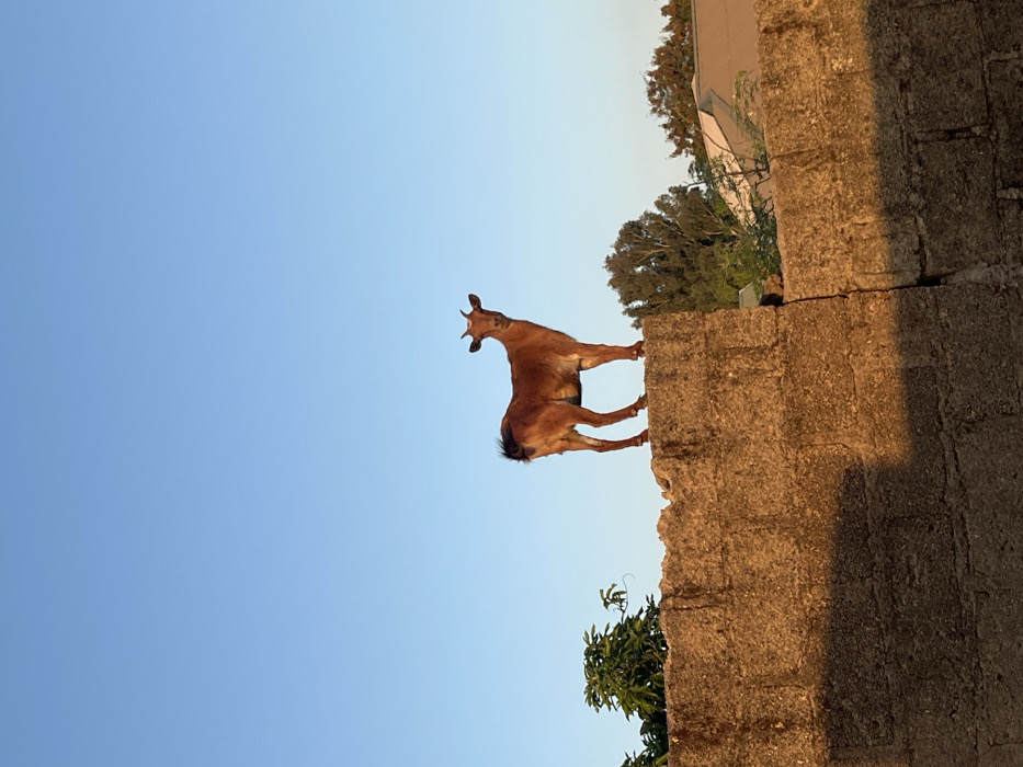 - "A brown goat stands atop a weathered stone wall against a clear blue sky" by FM-B0IJe2, licensed under CC BY 4.0
