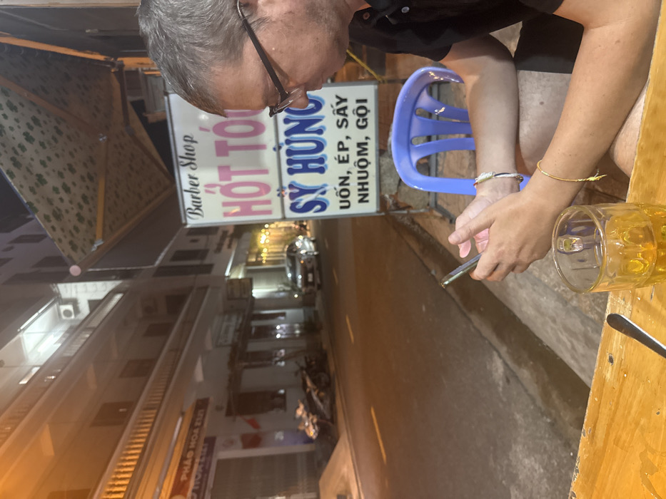 This image depicts an urban street scene at night in Nha Trang, Vietnam, viewed from an outdoor seating area. In the immediate foreground, a light-colored wooden table occupies the bottom portion of the frame. On this table, a clear glass mug containing a golden liquid is visible, along with a partial view of a silver utensil. A pair of hands, adorned with a gold-colored bracelet on the left wrist and a multicolored bracelet on the right, holds a smartphone horizontally over the table. To the right, a Caucasian male with short, light-colored hair and black-rimmed glasses is seated, facing partially away from the camera. He wears a dark short-sleeved collared shirt and intently looks down at a separate smartphone held in his hands; a light-colored bracelet is present on his right wrist. Behind the seated individuals, a white A-frame sign stands on the sidewalk. It prominently features "Barber Shop" in English at the top, followed by Vietnamese text: "HÓT TÓC" (pink), "SỸ HÙNG" (blue), and a list of services "UỐN, ÉP, SẤY NHUỘM, GỘI" (Perm, Straighten, Blow Dry, Dye, Wash). Above the sign, a green and white patterned awning extends over the sidewalk. A light blue plastic chair is partially visible behind the sign. Beyond the sidewalk, an asphalt street with a painted white centerline runs through the midground. Two motorcycles are parked on the left sidewalk, and a silver sedan is visible further down the street on the right side. Multi-story buildings, featuring balconies with railings and illuminated ground-level businesses, line both sides of the street. Air conditioning units are mounted on the building facades. The scene is illuminated by artificial light sources from streetlights and building interiors, indicating an evening or nighttime environment.