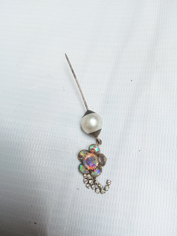 A single decorative pin is positioned centrally on a light-colored, textured surface in Ciherang, Indonesia. The pin consists of a slender, silver-toned shaft, sharpened to a point at its upper end. Approximately one-third of the way down from the pointed tip, a spherical, off-white, pearl-like bead is fixed to the shaft. Suspended from the base of this bead is a metallic charm. This charm features a primary flower-shaped element, approximately 1.5 cm in diameter, adorned with multiple faceted rhinestones. The central rhinestone is larger and exhibits an iridescent aurora borealis effect, reflecting hues of pink, orange, green, and blue. Surrounding the central stone are six smaller, similarly iridescent rhinestones forming the petals. Below the flower, a smaller, curved secondary dangle extends, comprising a series of approximately ten small, clear, faceted rhinestones set in metal. The underlying surface is uniformly light gray or white with a subtle, irregular linear texture and appears to be fabric or a soft material. Minor specks of dark debris are visible on the surface. No individuals or actions are depicted.