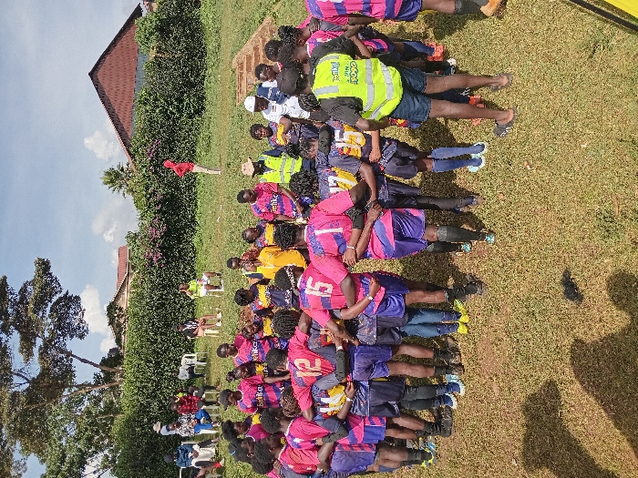 A group of people, many wearing soccer uniforms with pink and blue stripes, are huddled together. A person in a bright yellow vest stands among them. Behind the group, other individuals are sitting in chairs. The background includes a building with a red roof and lush green foliage. A person in a red outfit stands in the distance. The setting is a grassy outdoor area, possibly a park or field.