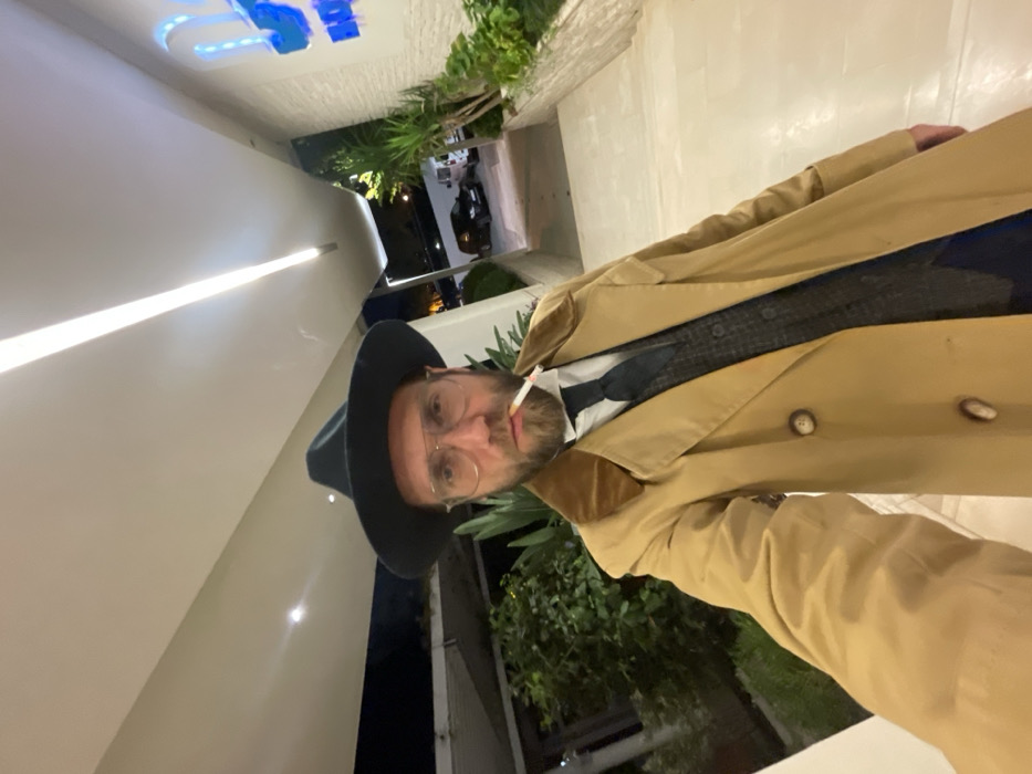 A man in a fedora, round glasses, and a tan trench coat poses indoors, smoking