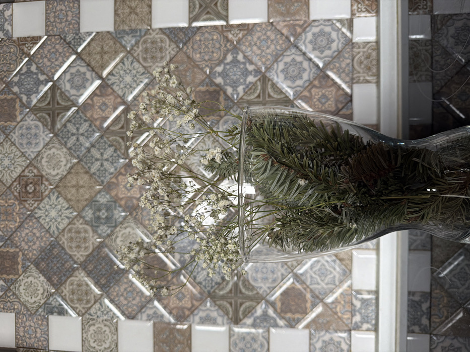 The scene depicts a static indoor arrangement. A clear, fluted glass vase, approximately 30-40 cm in height, occupies the central foreground. It contains multiple green coniferous branches, consistent with pine or fir, intermingled with clusters of dried white *Gypsophila* flowers. Several small, dark pinecones are present within the coniferous foliage. The vase rests on a flat, white horizontal surface, likely a countertop or shelf edge. Below this surface, a darker, patterned tiled backsplash or surface is partially visible. The background consists of a wall covered with glossy ceramic tiles arranged in a diamond pattern. The tiles are a mix of approximately 10x10 cm squares, featuring various intricate patterns (floral, geometric, arabesque) in shades of beige, brown, grey, and muted blue, interspersed with plain white square tiles. The plain white tiles are more prominent along the vertical edges of the visible wall section. No individuals or active interactions are present. The specific location within Rostov-on-Don, Russia, cannot be determined from the visual information provided.