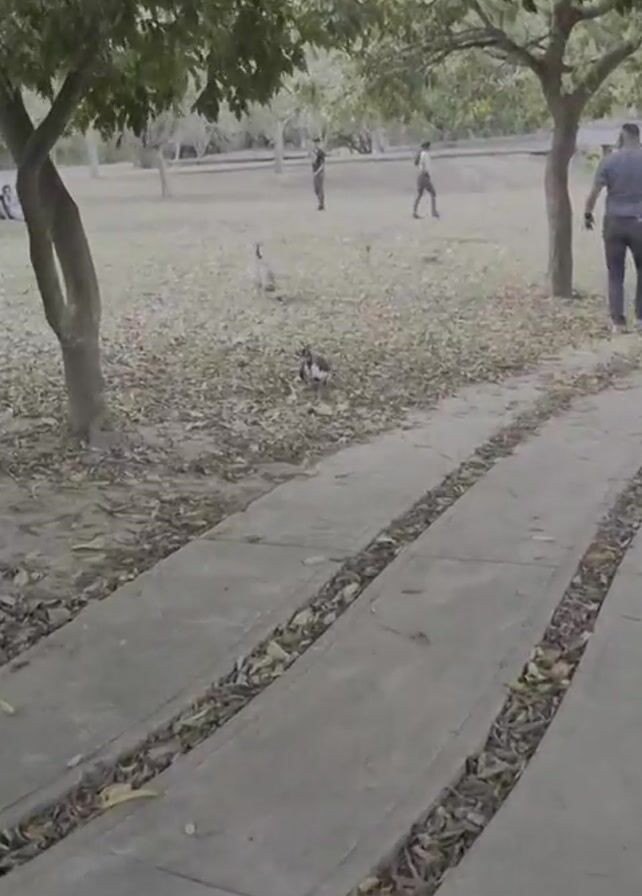 park with concrete paths leading into a grassy area covered with fallen leaves. Several trees with green leaves provide shade. In the grassy area, there are several people, some walking, some sitting, and some standing. In the foreground, a black and white bird pecks at the ground. Further away, several other birds that are greyish-brown are walking away from the path. A man in a dark shirt walks on the path towards the right side of the video. Overall, the park seems calm and peaceful.
