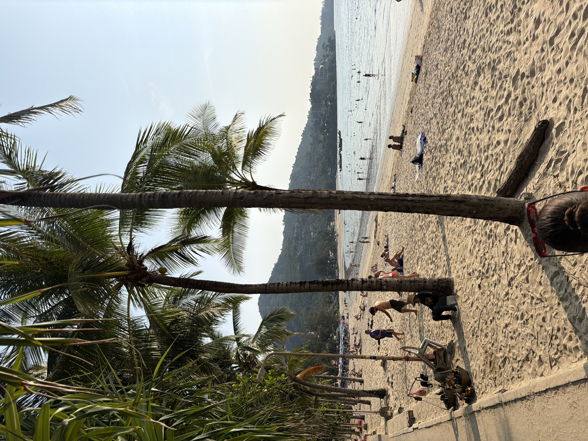 The image displays a daytime scene at Kamala Beach in Kamala, Phuket, Thailand. The perspective is from a low angle, looking across a sandy beach towards the Andaman Sea and distant hills. In the immediate foreground, the top of a person's head with dark hair tied back is visible, adorned with red-framed sunglasses resting atop the head. A light-colored concrete walkway runs along the left edge of the frame, separating from the main sandy beach area. On the sand, near the walkway, a person with dark skin is seated on a low stool beneath a tall palm tree, wearing a straw hat and dark attire. Adjacent to this individual are two large, woven baskets filled with small, dark objects, and a metal light pole stands erect. The midground is dominated by a line of mature palm trees with green fronds, extending vertically along the left and central portions of the image, casting shadows on the sand. The sandy beach is populated by numerous individuals engaged in leisure activities. Several people are walking; two men in shorts are visible near the seated vendor. Other individuals are relaxing, sunbathing on towels or directly on the sand. Further to the left in the midground, a cluster of colorful beach umbrellas indicates a denser gathering of beachgoers. The background features the calm, light blue water of the Andaman Sea, where a significant number of people are swimming, wading, and playing. Several traditional longtail boats are anchored further out in the bay. Beyond the sea, a series of lush green, tree-covered hills rises directly from the coastline, dotted with numerous buildings and structures, indicative of hotels or residences built into the terrain. The sky is clear and a pale blue. The scene is brightly lit by sunlight, suggesting late afternoon, with shadows extending across the sand.