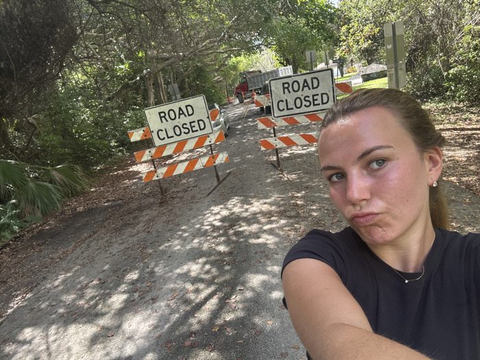 A female subject is captured in a selfie on an unpaved road in Palmetto Bay, United States, where access is obstructed by two "ROAD CLOSED" signs mounted on orange and white striped barricades