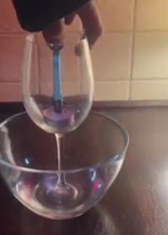 A person's hand removes a blue candle snuffer from atop a wine glass containing a lit candle, which sits inside a glass bowl