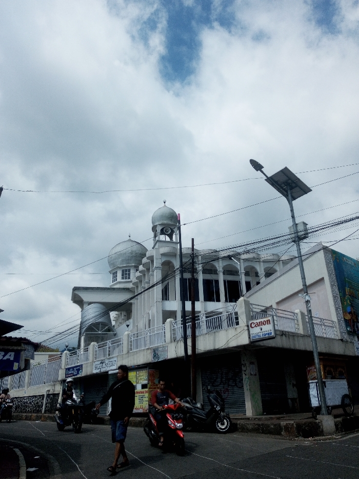 This image depicts a street scene in the city of Naung Bo Oe, Myanmar, under a partially cloudy sky with visible patches of blue. In the foreground, a paved road with faint white markings is visible. A male pedestrian, wearing a dark long-sleeved shirt, dark shorts, and flip-flops, walks from left to right across the road. To his right, a male motorcyclist in a red short-sleeved shirt and dark pants rides a red scooter-style motorcycle in the same direction. Another dark motorcycle with a rider is partially visible on the far left, also moving right. A parked dark scooter is positioned on the right side of the street, near a concrete curb. The dominant feature of the scene is a multi-story white building on the right, exhibiting architectural characteristics of a mosque, including two silver-colored domes. The larger dome, situated on a tower-like structure, features what appears to be a loudspeaker system. The building's upper levels showcase multiple arched windows and white railings along balconies. The ground floor contains commercial spaces, with several storefronts closed by corrugated metal shutters. A "Canon ImageRunner DIGITAL COPIER" sign is affixed to the building's facade at the lower-right section. A large, colorful mural or billboard is partially visible on the far right side of the building. Numerous black utility poles and a dense network of overhead electrical or communication wires crisscross the sky above the street. A tall streetlight with a solar panel mounted on its pole stands on the right side of the image. In the distant background, faint outlines of hills or mountains are discernible. The overall environment suggests a bustling urban or semi-urban area.