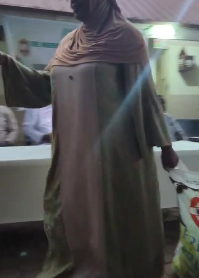Here's a breakdown of the video: A woman in a long dress and headscarf carries a bag of rice labeled "African Pride"