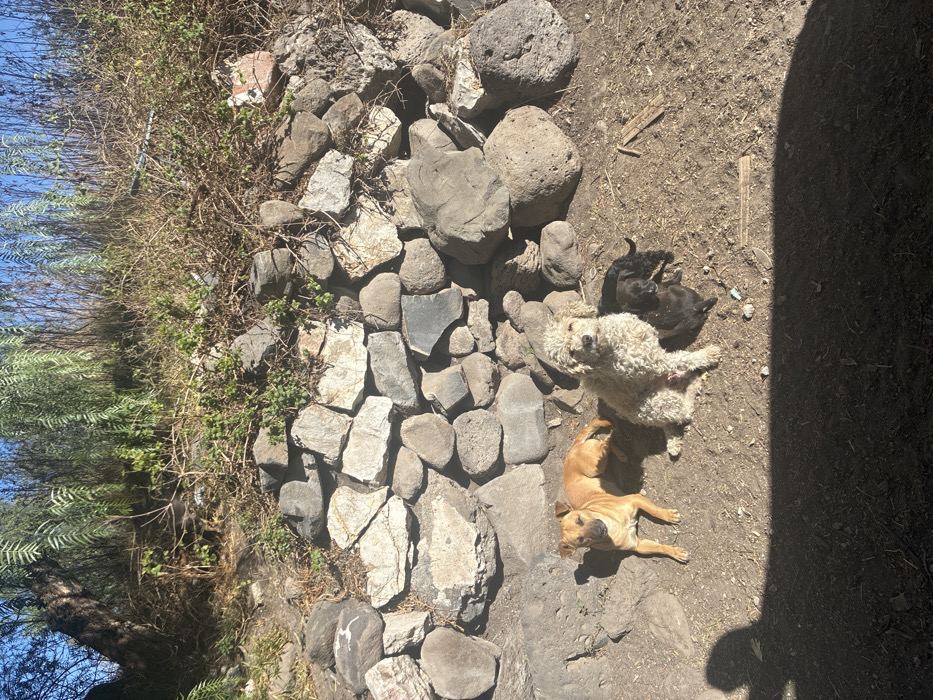 A sunny scene depicts a low rock wall bordering vegetation. To the right of the wall, on dirt ground, are three dogs. One is tan, one is fluffy and white, and two black puppies are nestled together. A shadow stretches in from the right edge of the image, partially covering the dogs.