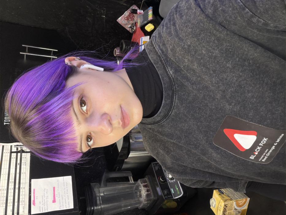 A young female with light skin tone and brown eyes, wearing a dark grey, acid-washed style t-shirt over a black turtleneck, poses for a selfie indoors. Her hair features vibrant purple bangs and top, transitioning to a darker shade towards the roots and sides. She has a stud nose piercing on her left nostril and multiple silver-colored hoop earrings in her right ear, along with a white wireless earbud in her right ear. The background, suggesting a commercial kitchen or cafe setting, features a black counter surface. To the left, a "Biolomix" blender with a clear pitcher containing dark liquid is visible. Next to the blender, a yellow and white carton labeled "Сливки" (Cream) in Cyrillic is present. Above the blender, handwritten notes in Russian are taped to a dark surface, partially obscuring a printed grid. A partial Cyrillic sign, "ТОП" (TOP), is visible further up. To the right, two metallic bar handles are mounted on a dark surface, likely a cabinet. Assorted small objects are scattered on the counter, including dark containers, a clear plastic container with a red substance and a "JUICE" label (resembling e-liquid), and a pack of multicolored markers. This scene is located in Sof'ino, Russia.