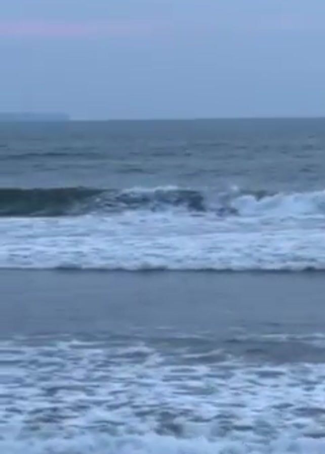 seascape under a dusk sky. Several waves are breaking on the shore, producing white foam against the dark water. A distant landmass is visible on the horizon. The sky exhibits a hint of pink, indicating the sun is either setting or about to rise.