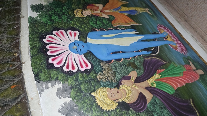 A painting depicts a reclining blue figure with a white sash, resting on a large pink and black lotus