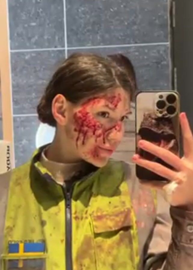 A young woman takes a selfie in front of a bathroom mirror. She wears a high-visibility yellow vest splattered with what appears to be blood. She has what looks like a large bloody wound around her right eye and cheek. She holds an iPhone with a brown phone case. The bathroom has gray tile and a white box labeled “BODY” is visible on the counter. The woman looks directly at the camera and then slightly to her left.