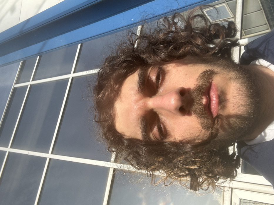 This is a close-up, selfie-style portrait of a young adult male, taken outdoors in Chatou, France. The subject has dark, curly hair extending to shoulder length, a prominent mustache, and a short beard. His eyes are partially closed or squinting, indicating direct exposure to bright sunlight, which illuminates the upper portion of his face and casts shadows beneath his nose and chin. He wears a dark blue garment, possibly a jacket, over a lighter shirt, visible around his neck and shoulders. The background features a large building with a grid of white-framed windows reflecting a bright sky with visible cloud formations. A distinct, textured blue vertical structural element or column is visible along the right edge of the frame, also under direct sunlight.