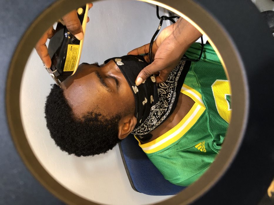 In Tomefa, Ghana, a dark-skinned male, estimated to be in his late teens or early twenties, is depicted from the chest up, viewed through a circular frame, likely a ring light. He has short, dark, curly hair and his eyes are closed. He wears a black bandana with a white paisley pattern covering his mouth and nose, secured around his neck. His attire consists of a green Adidas athletic jersey featuring yellow and white V-neck trim and a partial yellow digit (likely "0") on the chest. He is seated in a blue chair against a light-colored wall. Two dark-skinned hands belonging to a second individual are interacting with him. One hand, positioned from the upper right, holds a black and yellow electric hair clipper to the subject's forehead, indicating a haircut or hairline trimming in progress. The other hand, from the lower right and exhibiting light-colored fingernail polish, gently holds the subject's bandana near his jawline, possibly to adjust it or provide clear access for the clippers, and holds a black strap. The scene is brightly and evenly lit.