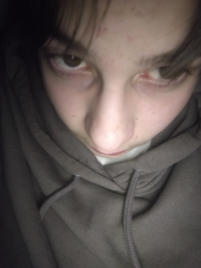 A close-up, slightly angled view of a person's face and upper torso dominates the image. The individual is wearing a hooded sweatshirt, the hood partially obscuring the left side of their face. Their eyes are directed upward, toward the camera. Freckles are visible on their forehead and cheeks. The lighting is subdued, casting shadows and creating a somewhat intimate and private atmosphere. The overall composition is simple, focusing attention on the person's face and expression.