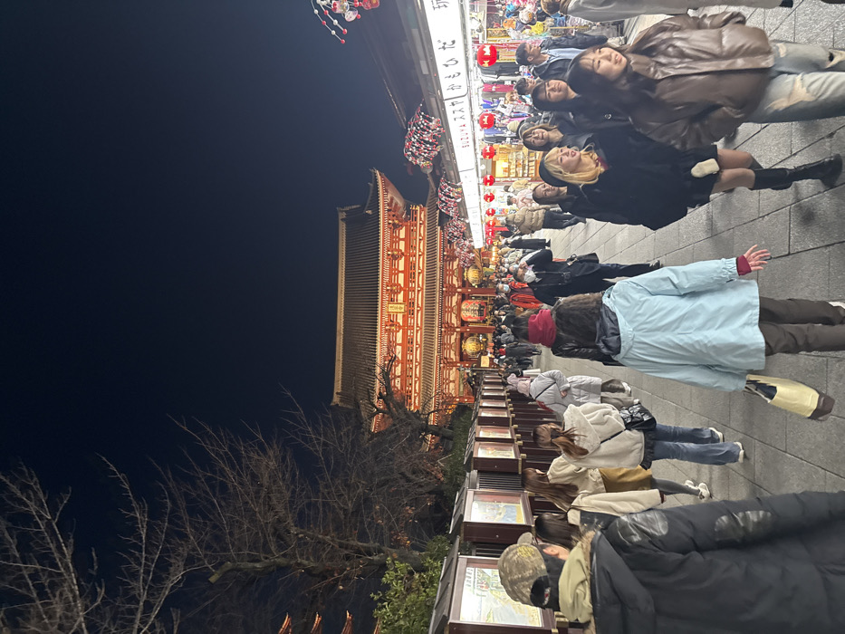 The image displays a densely populated nighttime scene on Nakamise-dori, a pedestrian pathway within the Senso-ji Temple complex in Asakusa, Taito, Japan