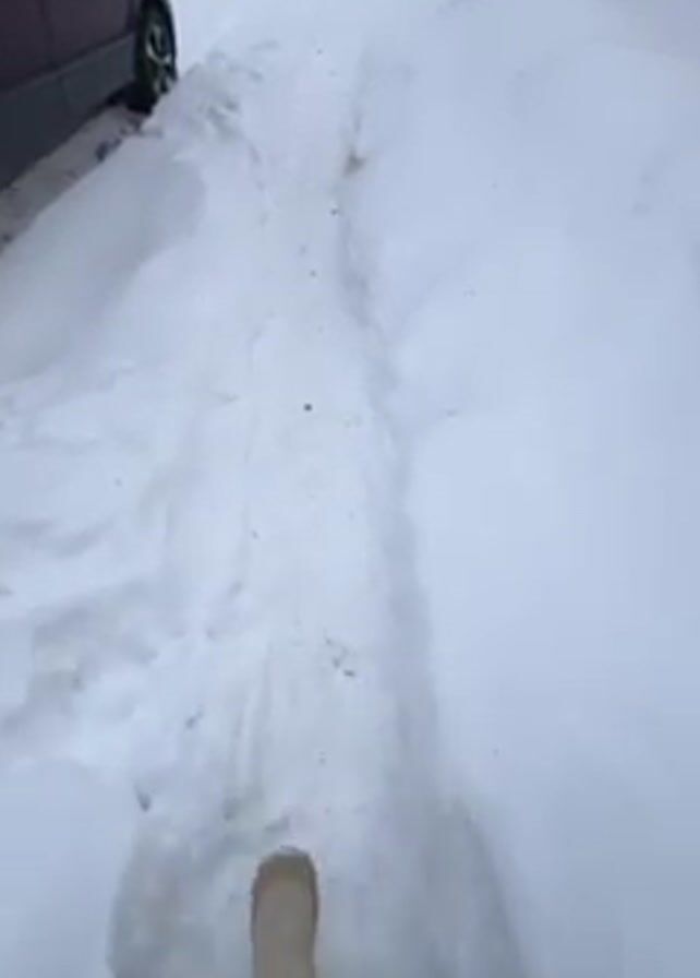 The video depicts a first-person perspective of someone walking through a snow-covered path. The path is narrow, flanked by deep snowdrifts on both sides. To the left, a maroon-colored car is partially visible, parked beside the path. The person is wearing light-colored boots and dark pants. The snow appears freshly fallen and untouched except for the narrow path carved through it. In the distance, houses and trees can be seen through the snowy landscape. The sky is overcast. The person continues walking forward along the snowy path.