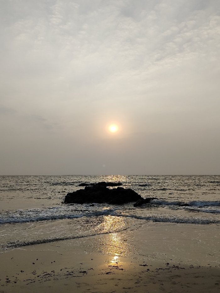 The image displays a coastal scene at Querim, India, characterized by a sunset or sunrise. The sky is predominantly light grey with scattered, thin, high-level clouds, and a pale yellow-orange tint near the horizon. The sun, a bright, diffuse yellow-orange orb, is positioned just above the horizon, slightly left of center. Its light creates a brilliant golden-yellow reflection path extending across the water and onto the wet sand in the foreground. The sea, appearing dark grey, exhibits moderate chop and small waves. A prominent, dark, irregularly shaped rock formation is situated in the mid-ground, partially submerged, with waves breaking around it. The foreground consists of wet, light brown sand with scattered dark debris, possibly seaweed, directly reflecting the sun's light in an elongated patch. Gentle waves are observed breaking on the shore, producing white foam. No individuals or specific human activities are present within the scene.