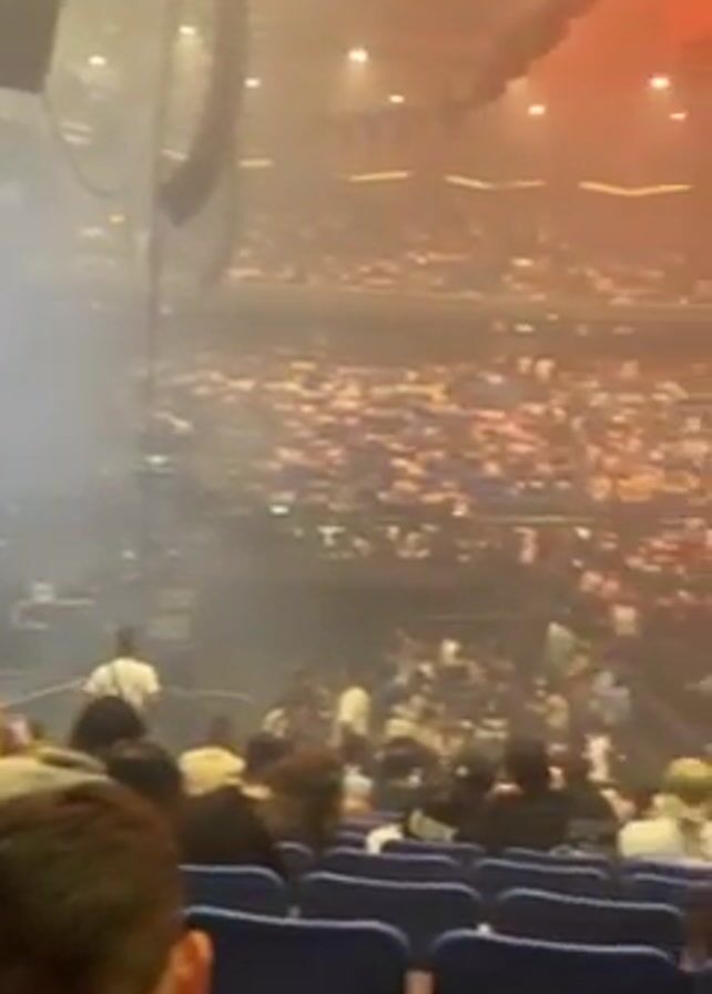 crowded concert venue. A large stage with bright lights and a screen displaying the letters "TDP" is visible in the distance. A substantial crowd fills the stadium, with many people standing and facing the stage. The camera angle is from the perspective of someone seated in the stands, looking down towards the stage. A light fog or haze fills the air, likely created by the concert's effects. Several people are seated in front of the camera, and some are looking at their phones.