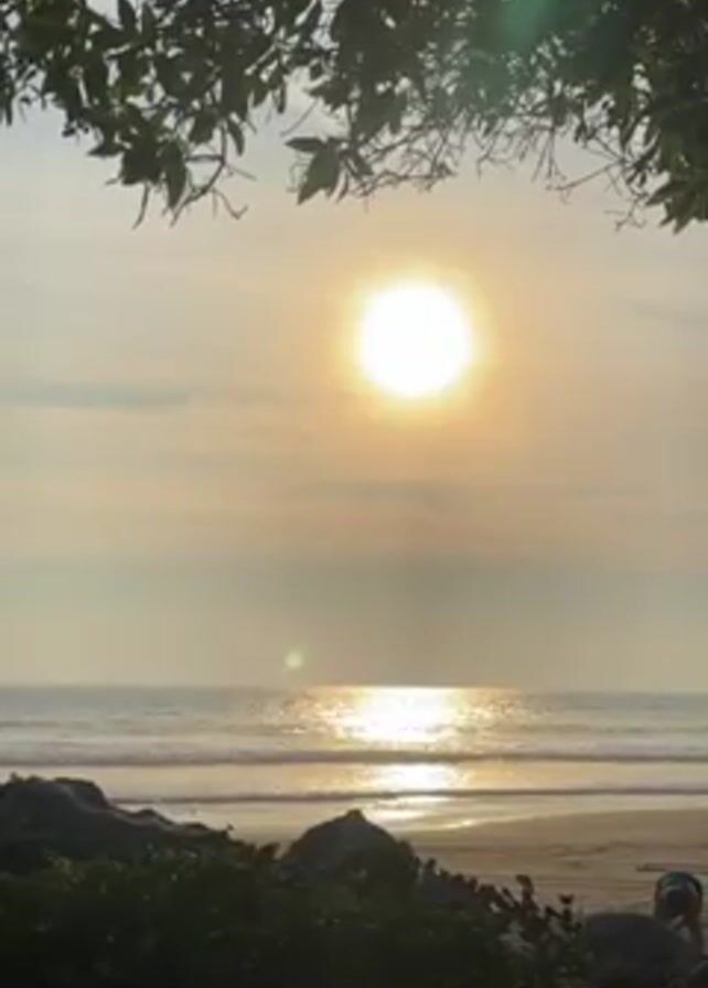 beach scene at sunset, framed by tree branches in the upper portion of the shot. The sun, a bright circular form, dominates the sky, its reflection shimmering on the ocean's surface. Gentle waves roll onto the sandy beach, and there are rocks and vegetation in the foreground. A person is present on the beach. The overall atmosphere is calm and serene.