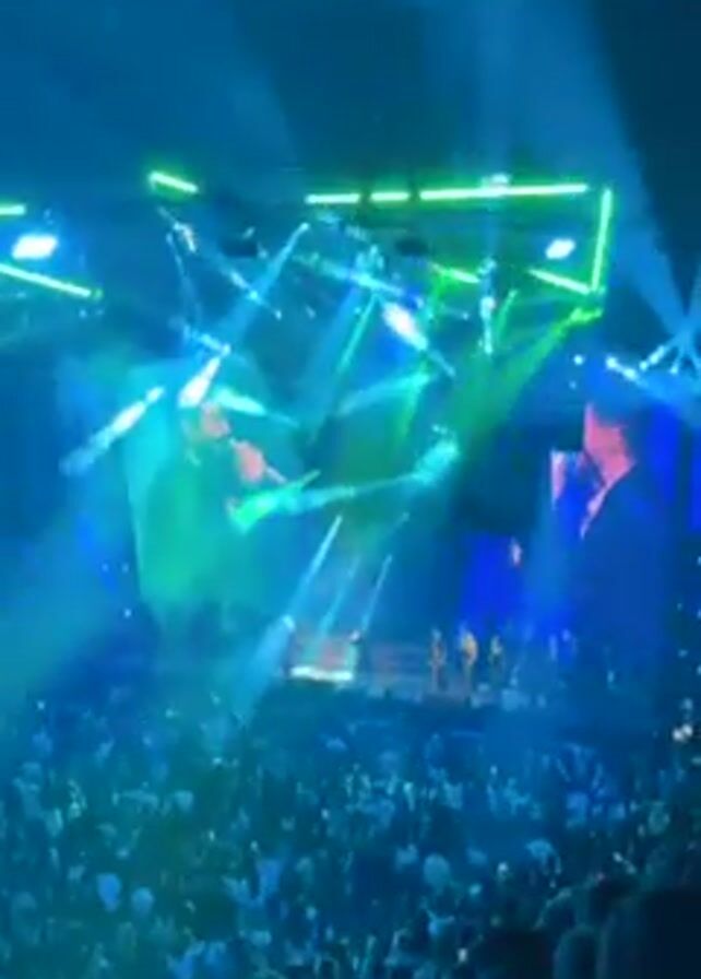This video shows a concert or live music performance. The video is shot from within the crowd, looking towards the stage. The stage has bright, multicolored lighting effects, with blue and green lights being most prominent. Two large screens flank the center of the stage, each displaying a close-up shot of a man singing, possibly the main performer. The crowd is large and dense. The audio seems to be capturing the music and the sound of the crowd.