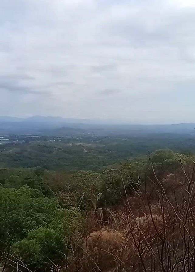 wide shot of a green landscape under a cloudy sky. The foreground is occupied by trees and dry, brown branches. In the middle ground, lush green trees cover rolling hills. Distantly, there is a hazy view of a city or a cluster of buildings in the flatlands. The sky is overcast with varying shades of gray. The viewpoint seems to be from a higher elevation, offering an expansive view of the terrain below. Electronic dance music is playing in the background.