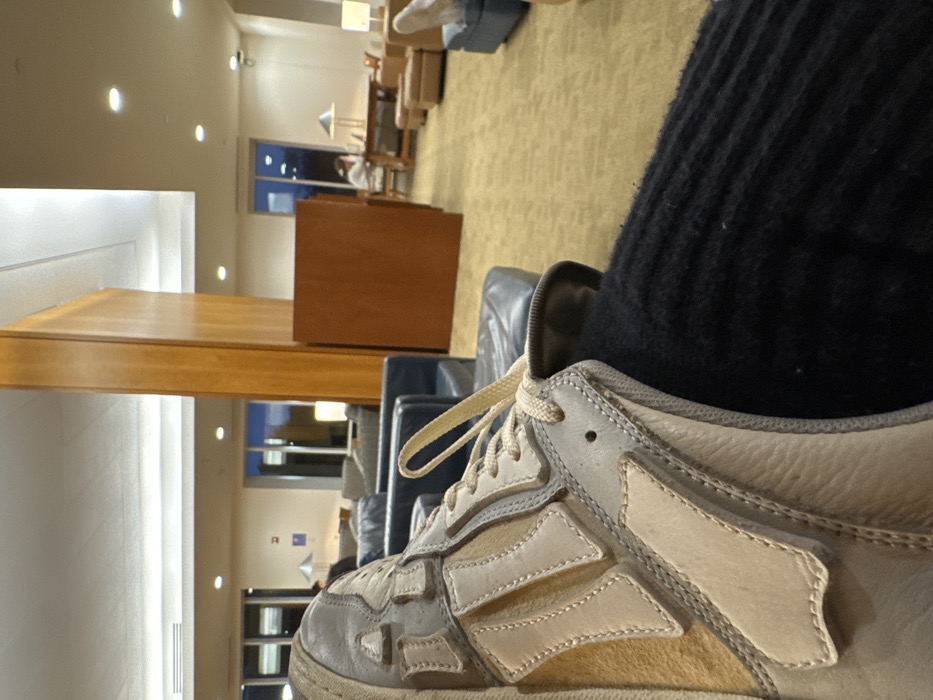 The scene depicts an interior view of a lounge or common area, identified as the Goldfarb Library at Brandeis University in Waltham, Massachusetts, during evening hours. The foreground is dominated by the observer's right foot, covered by a black ribbed sock and a worn light grey and beige sneaker with beige laces. The room features gold-patterned carpeting, a light-colored ceiling with recessed lighting, and large windows revealing a dark sky. Furnishings include dark blue leather armchairs and sofas, tan upholstered seating, and wooden tables with desk lamps. Tall wooden panels divide sections of the space. In the mid-background, a lone individual with dark hair, wearing a light top, is seated at a wooden table near a window, focused on an unseen activity. Another person's feet, clad in dark footwear, are partially visible resting on a blue upholstered chair in the far right. No direct interactions are depicted.
