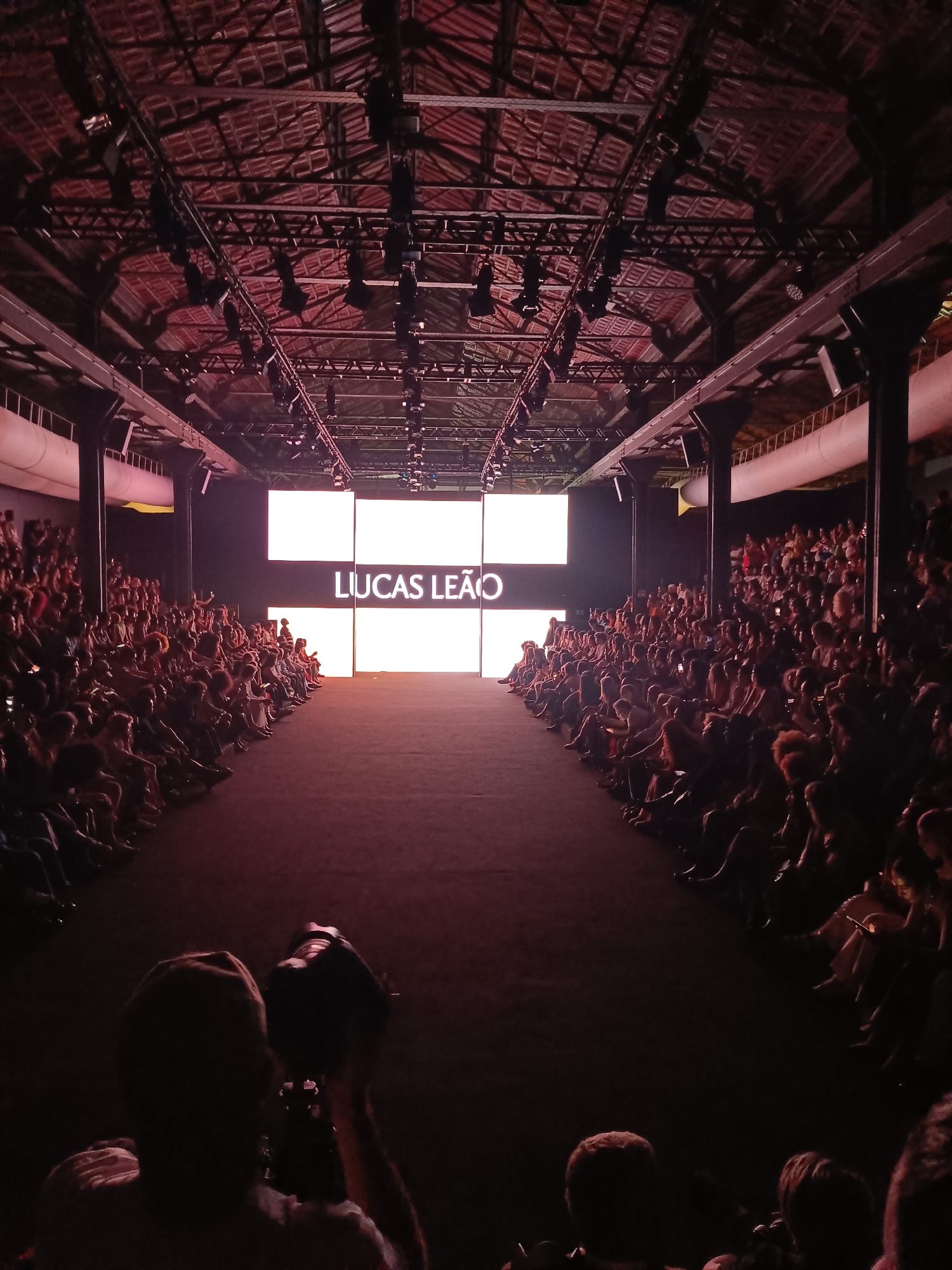 The image depicts a fashion show, likely in Rio De Janeiro, Brazil, indicated by the text "LUCAS LEÃO" displayed on a large screen at the runway's end