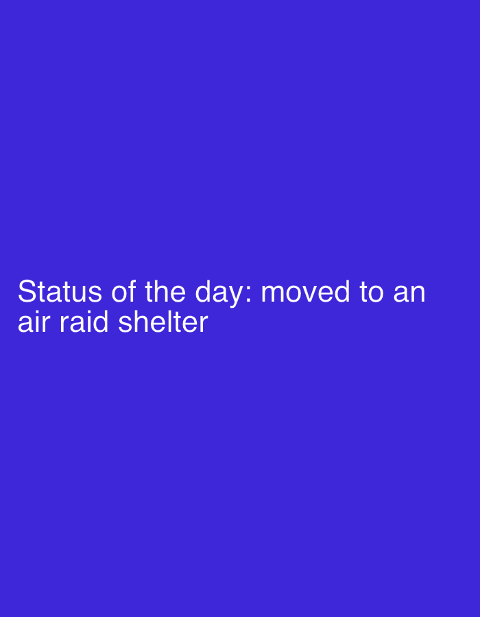 The image displays a solid royal blue background with white sans-serif text aligned to the lower left quadrant. The text reads: "Status of the day: moved to an air raid shelter." No other visual elements, people, or objects are present. The scene's environment, based on the text's content and the provided context, is implicitly a location in Kiryat Bialik, Israel, where an individual or group has undertaken the action of relocating to a defensive structure. The interaction is between the individual(s) and their environment, specifically an air raid shelter, in response to a perceived threat or directive.