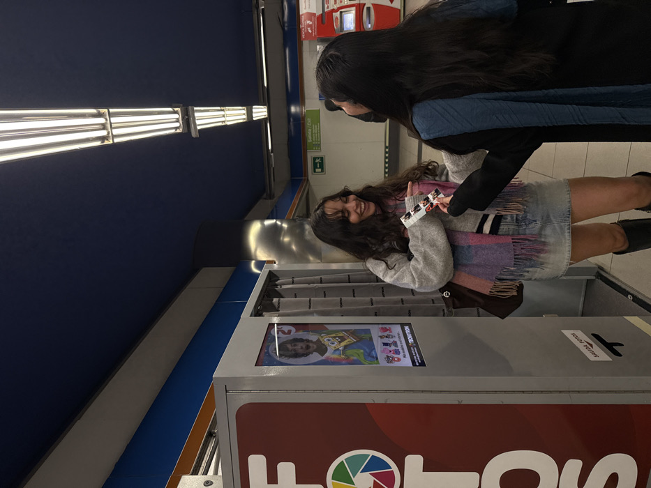 Two women stand near a photo booth, one holding a strip of freshly printed photos and smiling. She wears a gray sweater, denim skirt, and knee-high boots, with a colorful scarf. The other woman wears a black coat with a blue scarf and face mask. The photo booth features a digital display with cartoon characters and informational text. The booth's exterior has a large logo with the word "FOTOS". The background consists of a blue wall and fluorescent lighting.