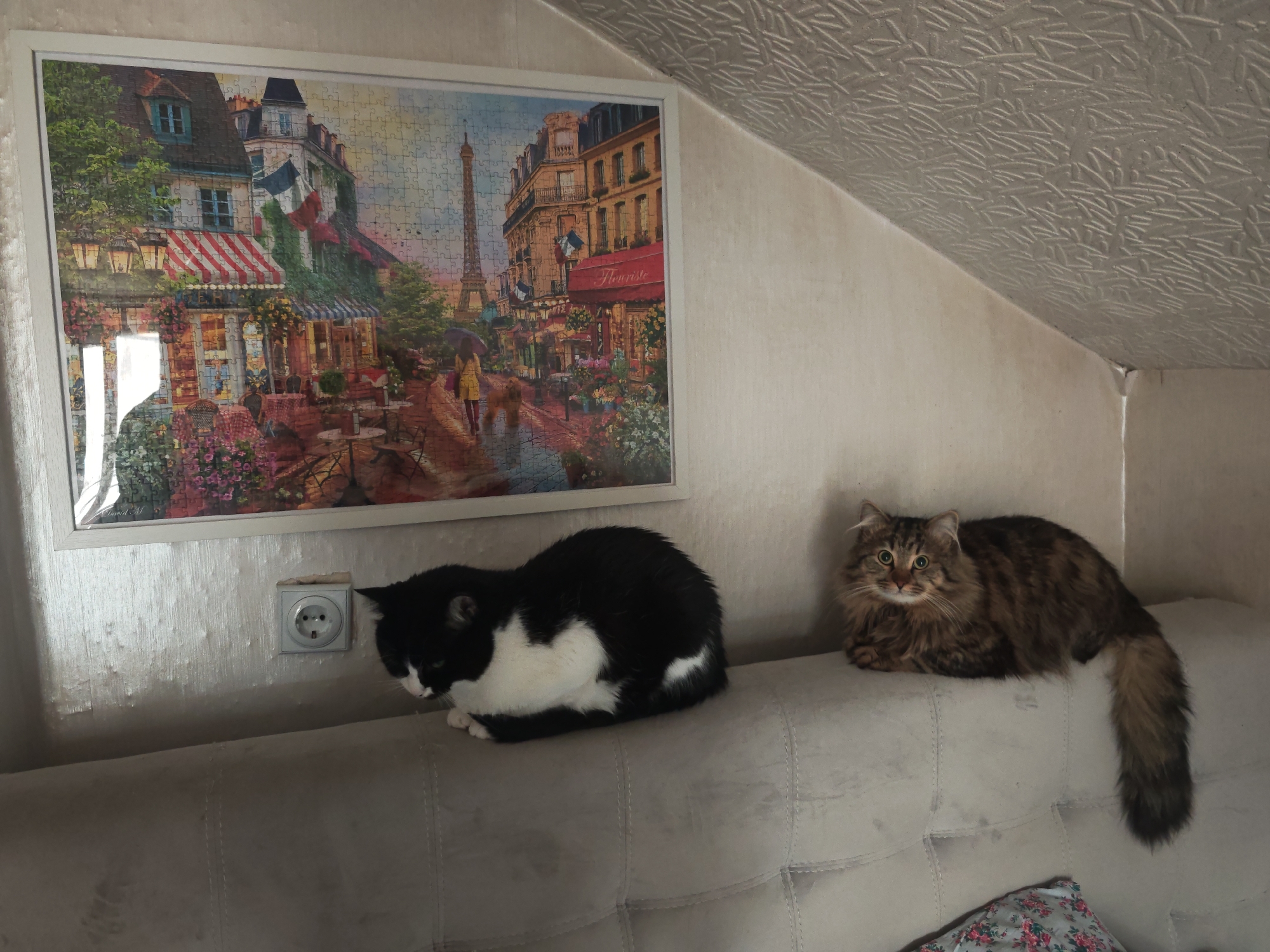 two cats sitting on a light gray couch. One is a black and white cat, while the other is a long-haired brown tabby. Above the cats, hanging on the wall, is a framed puzzle depicting a Parisian street scene with the Eiffel Tower in the background. An electrical outlet is visible on the wall to the left of the black and white cat. The ceiling is textured.