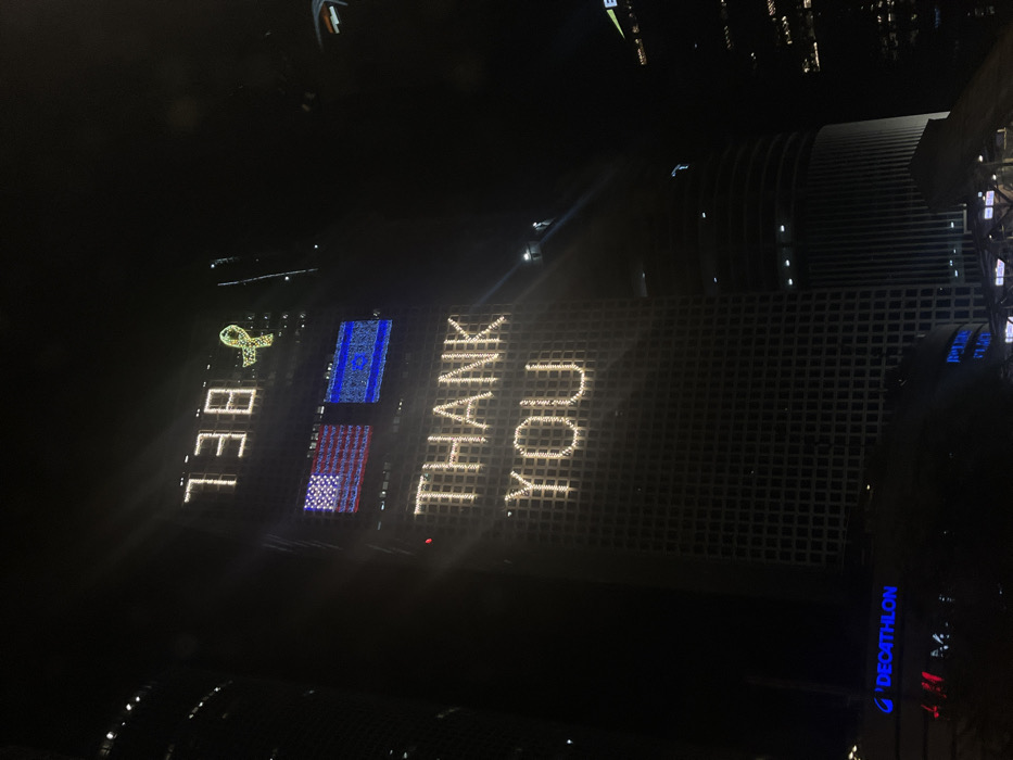 This image captures the Azrieli Square Tower, part of the Azrieli Center complex, in Tel Aviv, Israel, at night. The skyscraper's facade is extensively illuminated with large-scale light displays formed by activating lights within its windows. Near the top of the visible portion, the number "738" is displayed in bright white light, positioned to the left of a yellow ribbon symbol. Below this, two national flags are illuminated side-by-side: the American flag on the left, and the Israeli flag on the right, both rendered in their respective colors using the building's lights. Further down, the words "THANK YOU" are displayed prominently in two lines, centered on the building's facade. At the base of the tower, blue illuminated signs for "Decathlon" and "H&M" are partially visible. To the right of the Square Tower, a portion of another high-rise building with a curved facade, likely the Azrieli Circular Tower, is visible. The sky is dark, indicating nighttime conditions. No individuals are discernible in the frame.