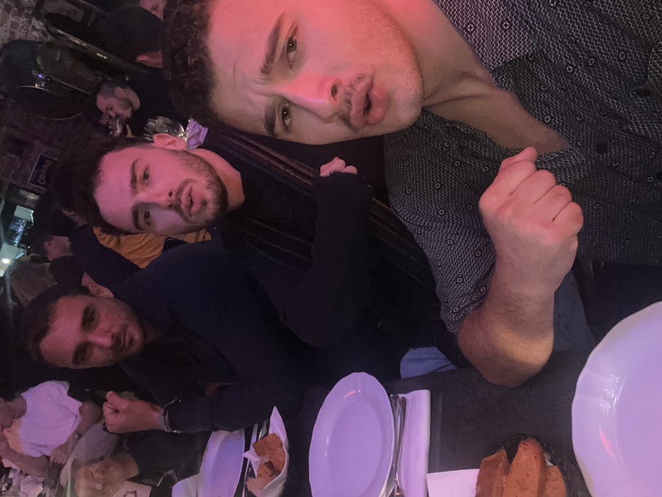 The image displays three males seated at a dark table in a dimly lit indoor establishment, identified as being in Milan, Italy