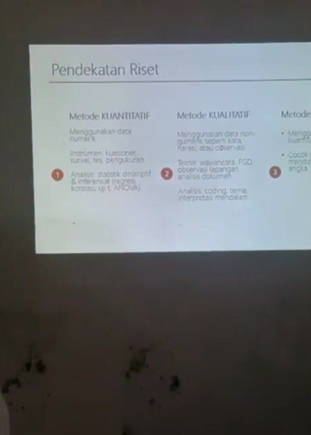 A video shows a presentation slide titled "Pendekatan Riset" (Research Approach) listing different research methods. The slide outlines quantitative, qualitative, and mixed-methods approaches, detailing their respective data collection methods and analytical techniques. The presenter's hand briefly appears, using a pen to point at the slide. The video is shot from an angle, with a wall visible in the background. The wall has some dark stains or discoloration.