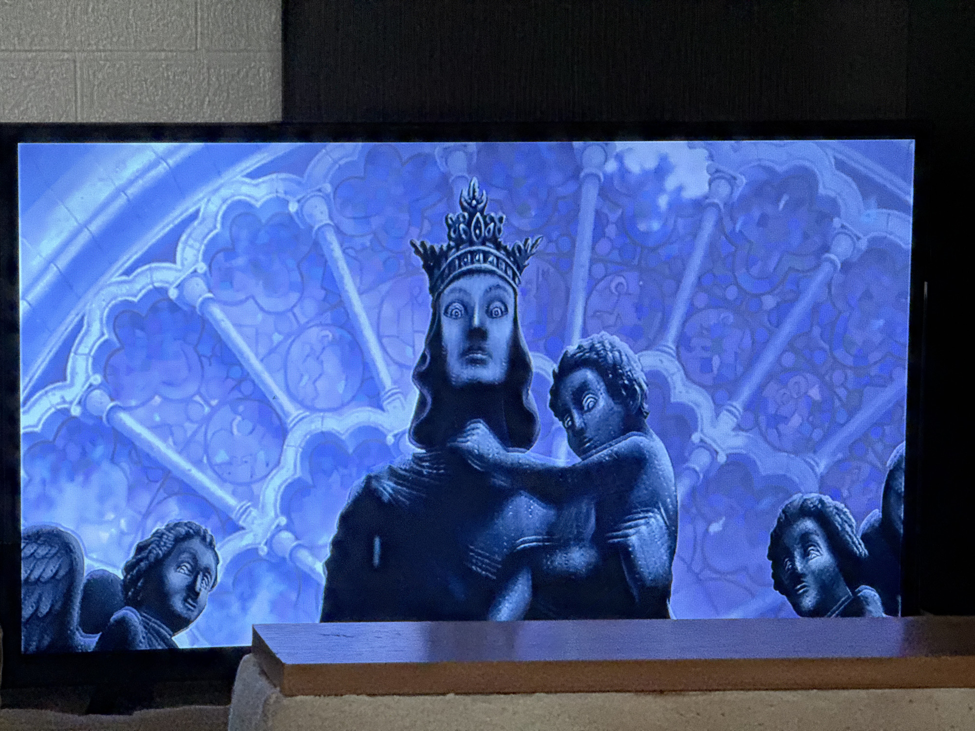 television screen displaying what appears to be a digital artwork of statues positioned in front of a blue, ornate background. The central statue depicts a crowned figure with wide eyes, and a smaller figure is embracing them. Two angel statues are partially visible on either side. The background resembles the design of a stained-glass window. There is no visible evidence in the image to confirm that the setting is Donetsk, Ukraine. The image is placed on a wooden surface.
