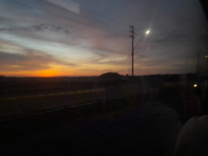 A scenic sunset paints the horizon in hues of orange and yellow, transitioning into muted blues and grays in the sky. A tall utility pole stands silhouetted against the fading light, its lamp casting a soft glow. The foreground is dark, suggesting the inside of a vehicle, while the blurred scenery outside hints at a road and distant landscape.