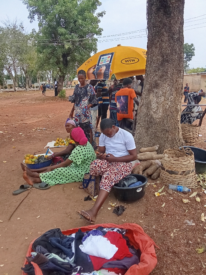This image depicts an active outdoor market scene in Akwanga, Nigeria. The ground consists of reddish-brown dirt, with a mature tree providing shade on the right side. In the immediate foreground, an open orange fabric bag overflows with assorted clothing items, including red, white, dark blue, and black garments. Scattered on the dirt near this bag are orange peels, small dark plastic fragments, a blue plastic water bottle, and a thin stick. In the midground, two women are seated directly on the ground. On the right, a woman wearing a white t-shirt and red-patterned capri pants is seated on a black plastic basin, actively looking down at and operating a mobile phone in her hands. Brown flip-flops are visible on her feet. Adjacent to her, a black plastic basin contains additional items. Behind her, a pile of large, light brown yams rests against the tree trunk. To the right of the yams, two woven baskets of differing sizes stand next to a smaller black basin. To the left of the first seated woman, another woman sits on the dirt, dressed in a light green polka-dotted dress and a pink headwrap. She is barefoot, with a pair of dark grey flip-flops placed nearby. In front of her is a large blue bowl filled with oranges, alongside a small white cloth and some black plastic bags. Behind the seated women, a young woman stands upright, wearing a patterned dress, looking towards the left of the frame. Further back, beneath a large yellow MTN branded umbrella featuring a smartphone advertisement, a group of individuals, predominantly men, are congregated. One man, seen from the back, wears an orange t-shirt with a graphic print. The background reveals a dusty, open area with numerous green trees, light-colored buildings, and several indistinct figures moving or standing in the distance. Utility poles and overhead wires are visible against a hazy sky. The overall environment suggests a bustling commercial area under diffused daylight conditions.