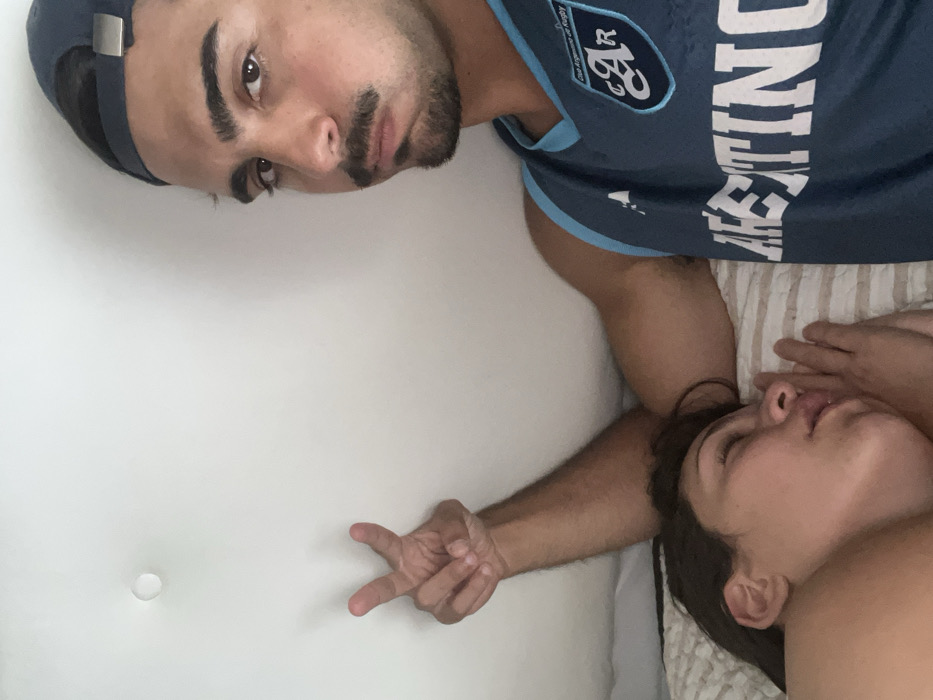 An image depicts two individuals in an indoor setting, likely a bedroom, with a plain white ceiling or wall as the background. On the right, a light-skinned male with dark hair, a mustache, and a goatee is visible from the chest up, looking directly at the camera with a neutral expression. He wears a backward blue baseball cap and a light blue sleeveless athletic jersey featuring "Club Argentino de Rugby" and "ARGENTINO" text. His left arm is extended upwards, with his hand forming a V-sign. Below and to the left of the male, a light-skinned female with dark hair is visible, lying on her side and appearing to be asleep. Her face is in profile, and her hands are near her face. She rests on a striped pillow or sheet. The specific location within Sarandí, Argentina, is not discernible from the visual evidence.