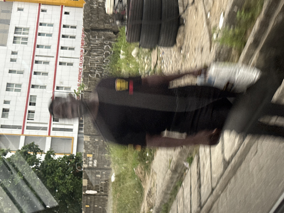 The image depicts an outdoor urban scene in Ilado, Nigeria, near the Florence Oluokun Emergency facility. A blurred, dark-skinned adult male is walking from left to right on a paved sidewalk. He wears a dark, short-sleeved shirt with a yellow and red insignia on his right sleeve and dark trousers. He carries a white plastic bag in his right hand. In the background, a multi-story, light-colored building with red horizontal banding and multiple windows is visible, identified by "FLORENCE OLUOKUN EMERGENCY" text. A grey concrete block wall, defaced with graffiti including "SAI FURNITURE" and a phone number, runs between the individual and the building. Behind this wall, a stack of three black vehicle tires is present on the right, and sparse vegetation is scattered throughout. The perspective suggests the photograph was taken from a moving vehicle, causing motion blur on the subject and diagonal reflections on the image's surface.