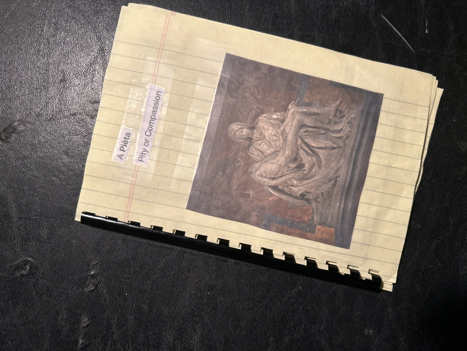 A notebook with yellow, lined paper is open on a black surface. The notebook is bound with a black spiral spine. Affixed to the page is a printed image of a statue depicting a Pièta, a classical representation of the Virgin Mary cradling the deceased body of Jesus. Beside the image, labels taped to the page read, "A Pièta" and "Pity or Compassion."