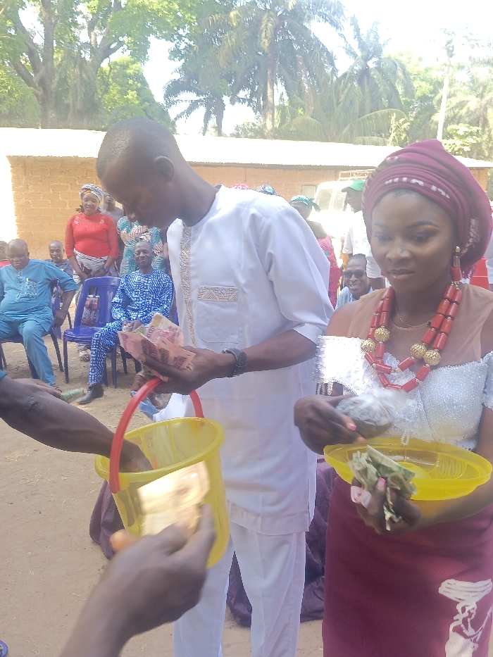 A man in a white shirt and trousers holds money over a yellow bucket, as another arm extends to drop money into it. To his right, a woman in a red headwrap, white sequined top, and red skirt holds a yellow plate filled with money. Both are surrounded by a crowd of people, some seated and others standing. The background includes trees and a building. The overall scene suggests a celebratory or ceremonial occasion.