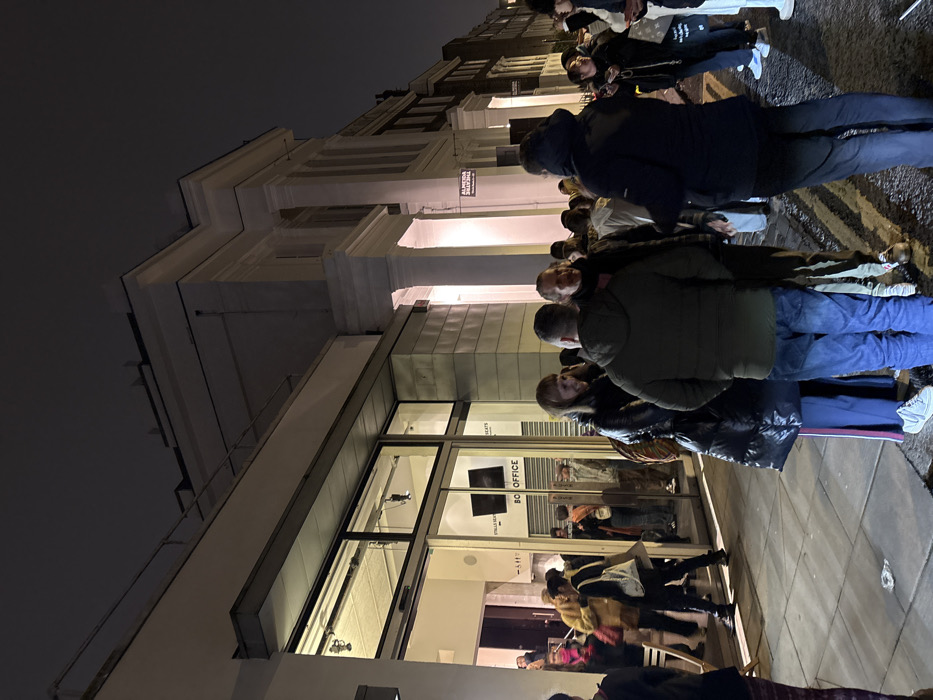 A line of people waits outside a building at night