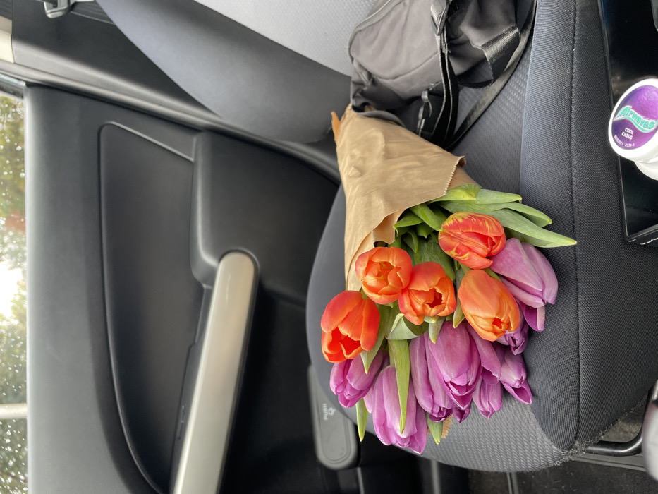 The image displays the interior of a vehicle, described as being located in Herzliya, Israel. A bouquet of approximately 15-20 tulips rests on the front passenger seat. The tulips exhibit a color scheme of vibrant orange and magenta/purple, with green stems and leaves, and are partially encased in plain brown craft paper. The passenger seat is upholstered in dark gray or black fabric. Adjacent to the bouquet, a black strap, indicative of a bag or backpack, is visible. The vehicle's passenger door panel, constructed from dark gray plastic, features a silver-toned horizontal trim piece functioning as a door handle and armrest. Below the door handle, a small rectangular mechanism with the label "PUSH" is discernible. In the lower right corner of the foreground, a small white plastic container with a partial purple label is positioned on a dark surface. The front passenger window, visible in the upper left, shows numerous raindrops, suggesting recent or ongoing precipitation, with an out-of-focus background of greenery and indeterminate structures beyond. No individuals are present in the scene.