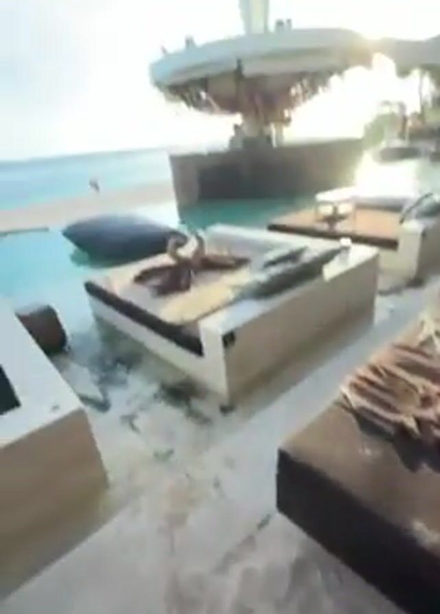 person standing on a sandy beach next to a chaise lounge and small round table with a fruit tray, drinks, and straws. There are bare feet visible in the foreground. The camera then shifts upward to show a woman in a black bikini standing in front of a tall, intricately designed building structure with bamboo elements, palm trees, and a swimming pool in the background. The woman smiles and waves at the camera.