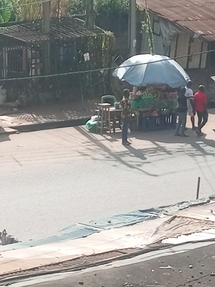 The image depicts a daytime street scene in Onitsha, Nigeria. A street vendor's stall is prominently positioned on the side of a paved road. The stall features a light blue umbrella providing shade over a table-like structure holding multiple green plastic crates containing produce, visible as fruits or vegetables in various colors including red, yellow, and green. Adjacent to the stall, a small wooden table with a smaller stool and a light-colored plastic chair are present, with green plastic bags on the ground nearby. Four individuals are visible. One male, wearing a patterned shirt and blue trousers, stands to the left of the stall, facing the street. Two other males are to the right of the stall: one in a white short-sleeved top and light trousers, the other in a red short-sleeved top and dark trousers, both appearing to be walking or standing near the stall. A fourth individual is partially obscured behind the right side of the stall. The background on the left shows a structure with a dark, grated roof and sides, partially covered with dark green vegetation. A light-colored object hangs on this structure. To the right, buildings with corrugated metal roofs are visible, one appearing light-colored, another darker. The walls of these buildings show light coloration and some are covered with draped tarpaulin material. Overhead wires traverse the upper portion of the frame. The paved road in the foreground and mid-ground is light grey, with elongated shadows cast across its surface, consistent with sunlight from an elevated source. The bottom foreground reveals the edge of a structure covered with layered tarpaulins in shades of blue, beige, and brown.